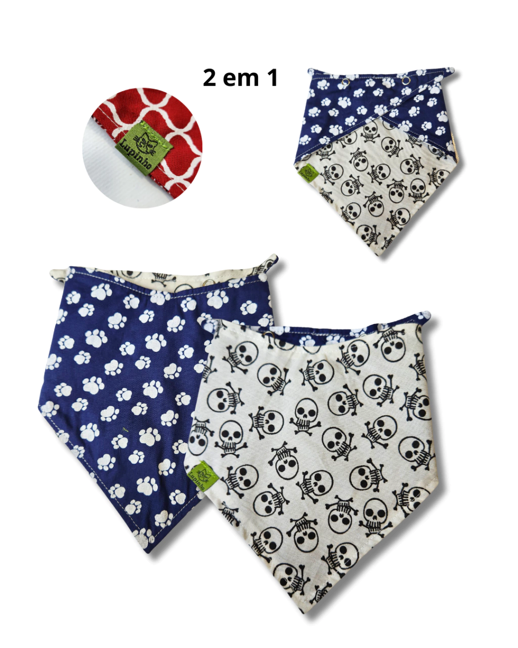 Palavras chave: bandana pet 2 em 1 dupla face lupinho o gato estampa caveira e patas patinhas cachorro gato babador branco azul