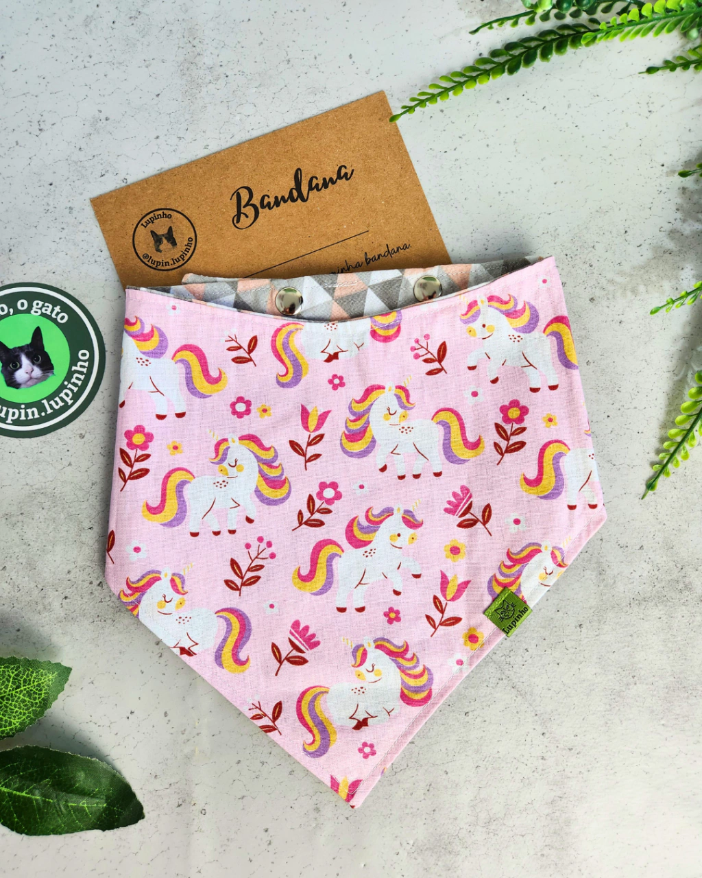 Palavras chave: bandana pet 2 em 1 dupla face lindinha lupinho o gato estampa unicornio triângulo geométrico rosa