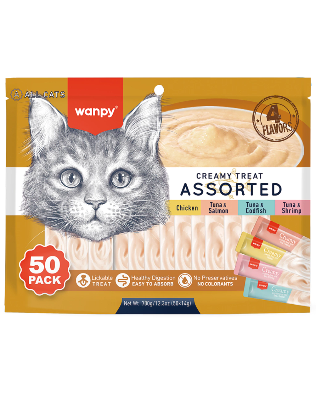 Contendo 50 unidades os Creamies Sortidos promovem um aumento na ingestão hídrica dos MIAUmigos, com diversas opções saborosas! O Creamy com sabores Sortidos promove um aumento na ingestão hídrica dos MIAUmigos, além de ser saboroso e saudável. Você pode adicionar o creamy junto com a ração seca, ou oferecer diretamente para o gato.